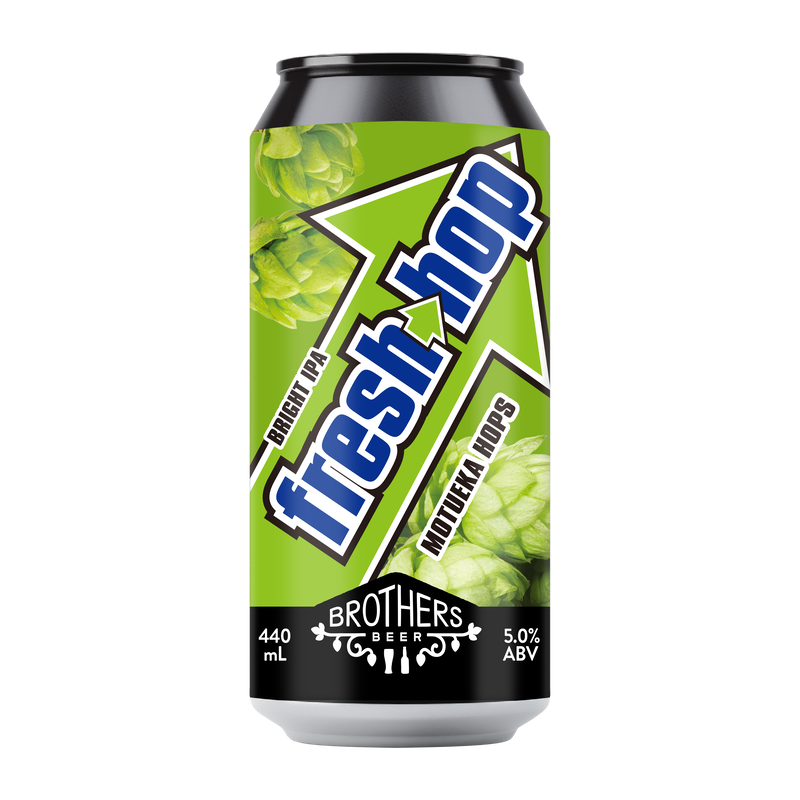 Motueka. The hop that makes other hops better. That big, lemon and lime hit, with tropical undertones makes it perfect for a crushable Bright IPA. Brothers Beer dumped a bunch of beautiful fresh hops into the hop back, then flash froze more cones with liquid nitrogen, vacuum sealed them, and added them as a second dry hop. The result is limey, grapefruity, grassy and above all, fresh. Freshen up with Fresh-Hop.